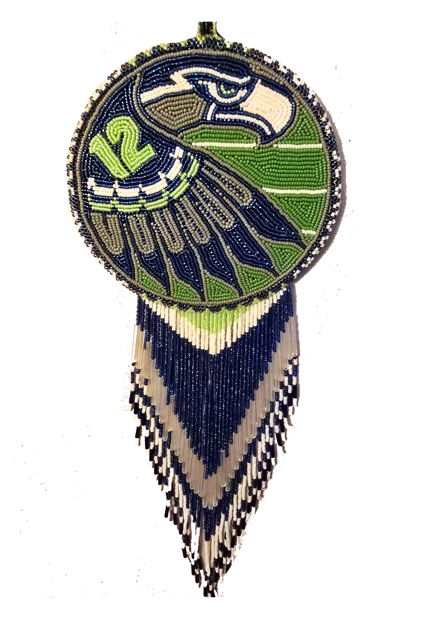 Seven sets of beadwork earrings, including dreamcatchers, red hand prints, Seahawks eyes, purple W's for the University of Washington, and more